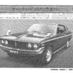 Toyota Corona Mark II GSS promotional advertisement featuring a front three-quarter view of the vehicle with Japanese descriptive text about…
