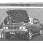 Toyota Corona Mark II promotional material showing a person inspecting the engine bay of a Mark II vehicle with the…
