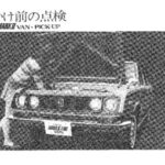 Pre-departure inspection points for the Toyota Corona Mark II Van and Pick-up model showing a person examining the vehicle's front…