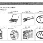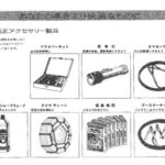 Catalog page showing常時携行品 (standard equipment/tools) including owner's manual, driver's net, tire rope, tire flag, tire chain, tire gauge, and fire…