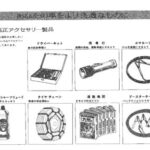 Parts and accessories catalog page showing常時携行品 (items to always carry) including owner's manual kit, flashlight, tire gauge, fire extinguisher, tire…