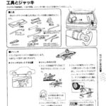 Vehicle tools and jack usage instructions showing storage locations of standard tools like wrenches and pliers in the driver's side…